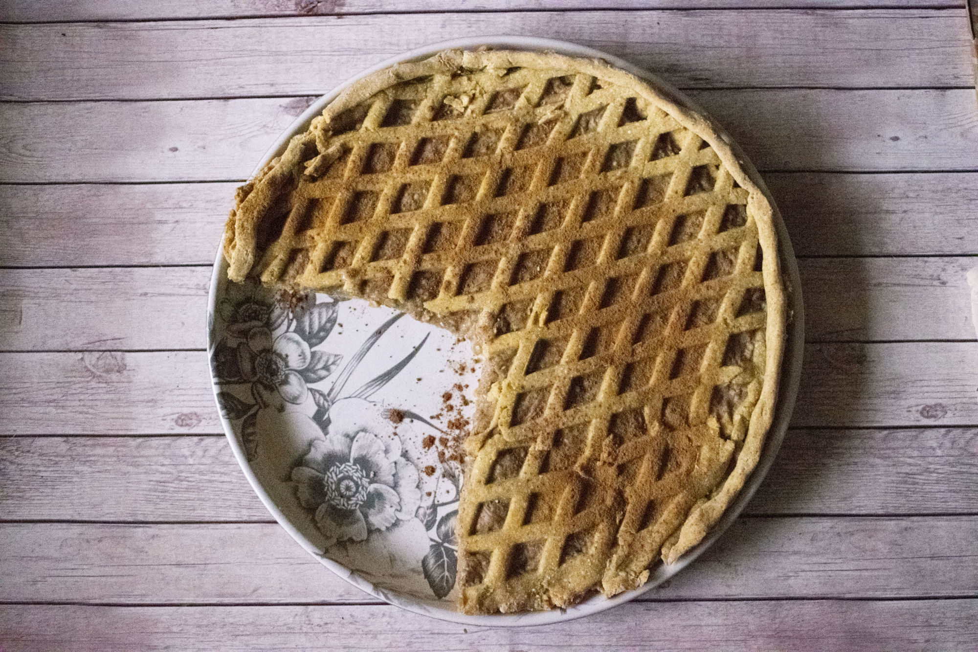 Následne po uplynutí času cesto z chladničky vyberieme a vyvaľkáme na hrúbku 0,5 – 1 cm. Vystelieme ním spodok a okraje plechu. Zvyšok si odložíme bokom a použijeme neskôr ako mriežku.